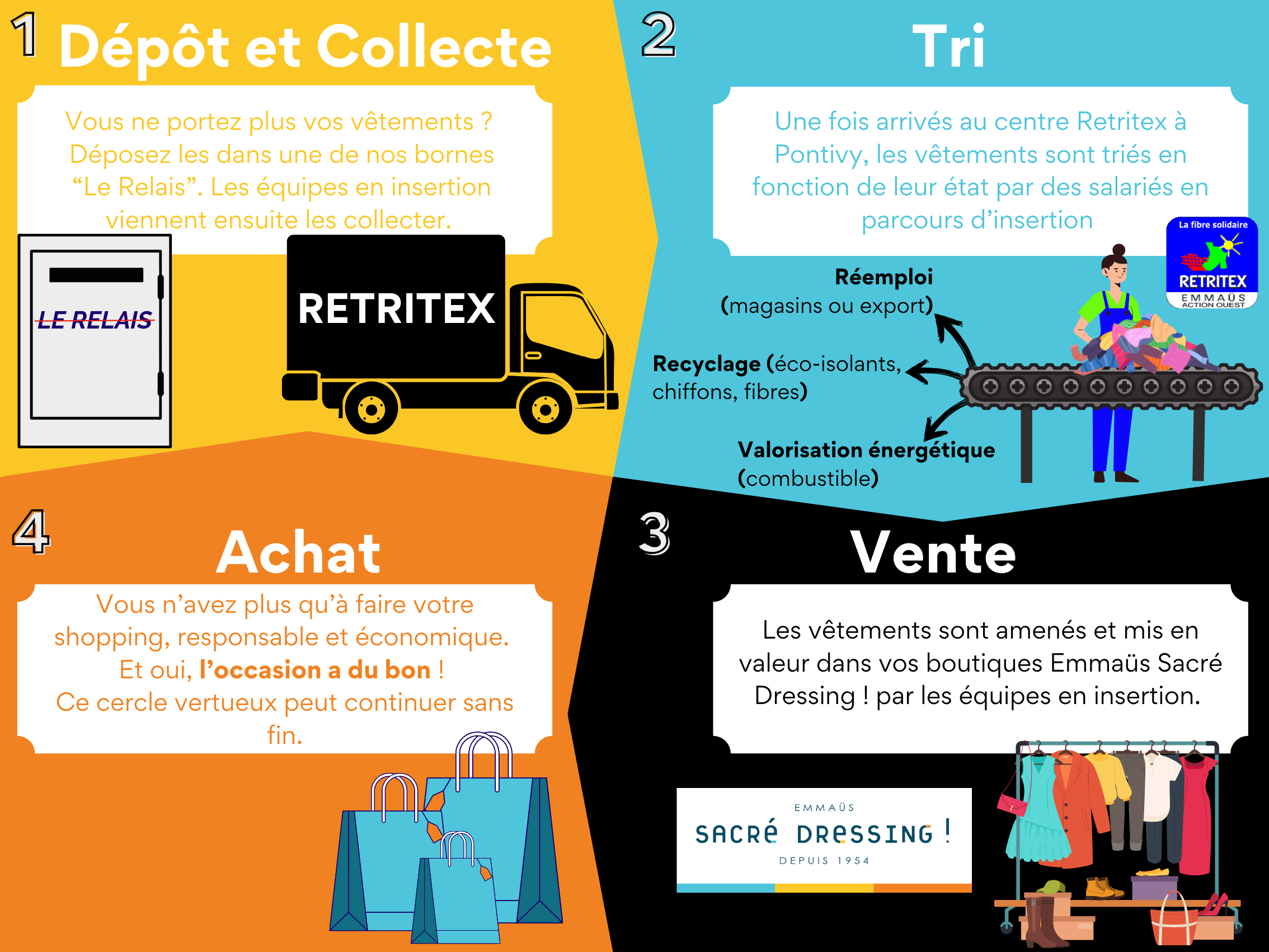 Le circuit du textile dans les boutiques Emmaüs Sacré Dressing ! du don jusqu'à la revente en boutique.